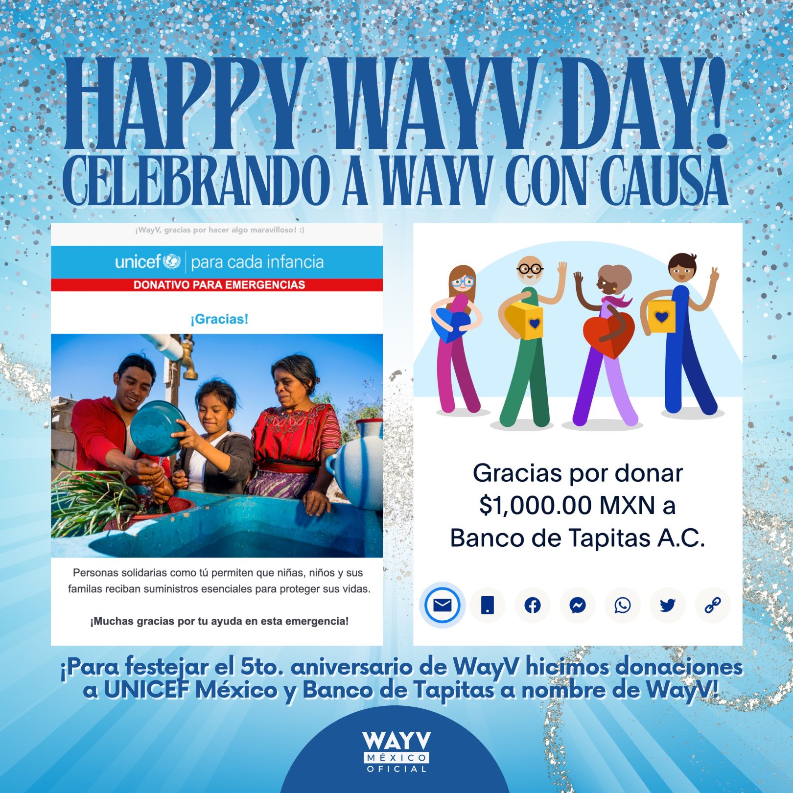 Con motivo del 5to aniversario de WayV, WayV México Oficial realizó a nombre de WayV dos donaciones a dos causas significativas: UNICEF y Banco de Tapitas.